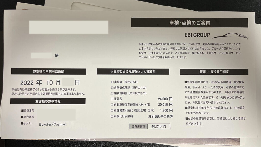 ポルシェセンターでの車検の流れと私の車検の価格をご紹介しました。