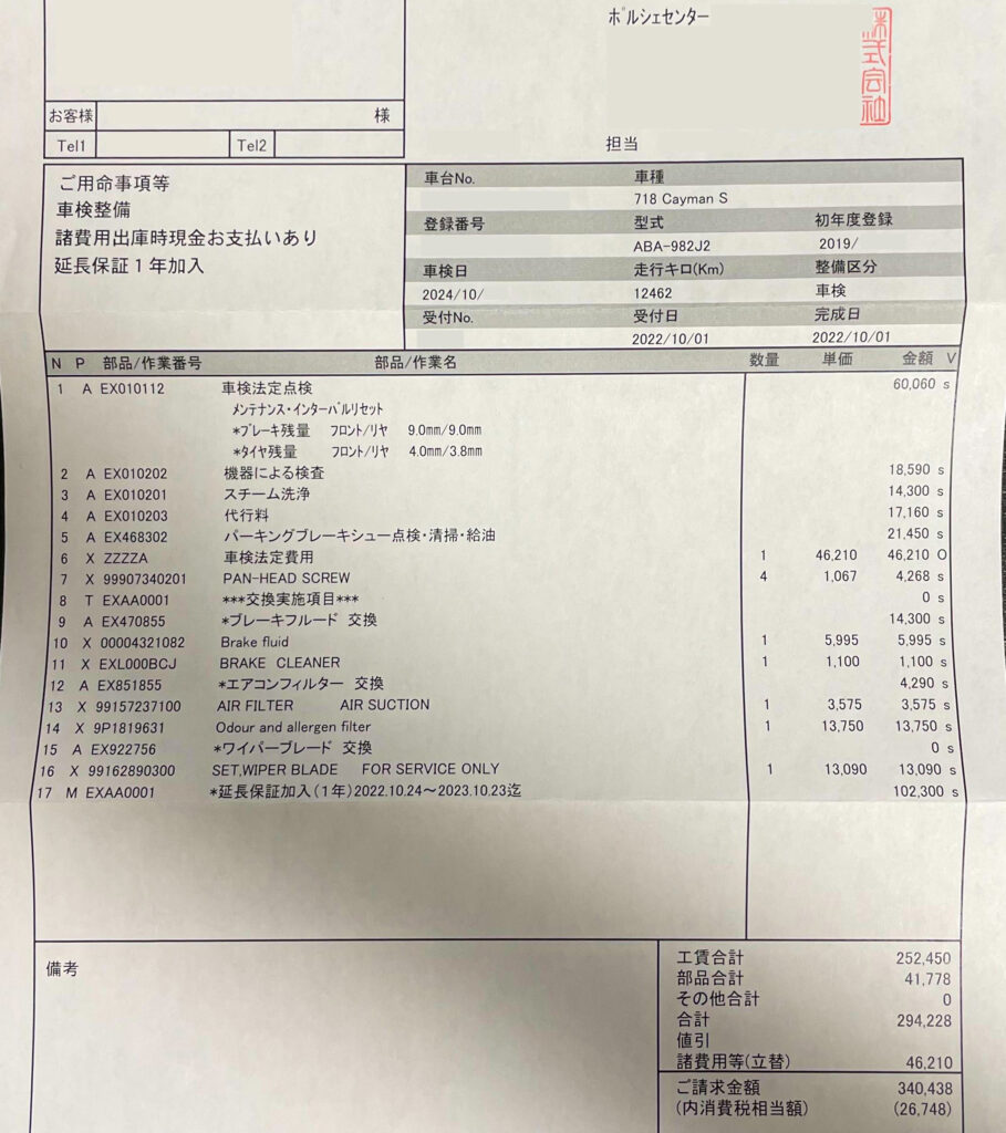 ポルシェセンターでの車検はやはり少し高いということを聞いていたので、どこで受けるか少し迷いましたが、保証を延長したかったのと付き合いのあるお店もないのでポルシェセンターで受けることにしました。